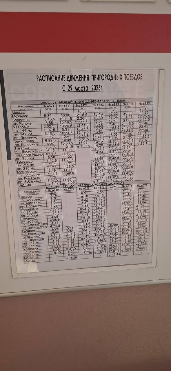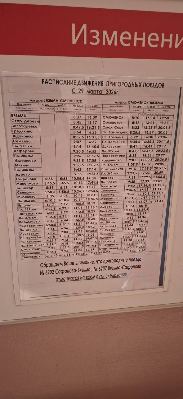 С 29 марта 2026 года в регионе вносятся изменения в график движения пригородных поездов на направлениях Вязьма — Смоленск и Вязьма — Москва.