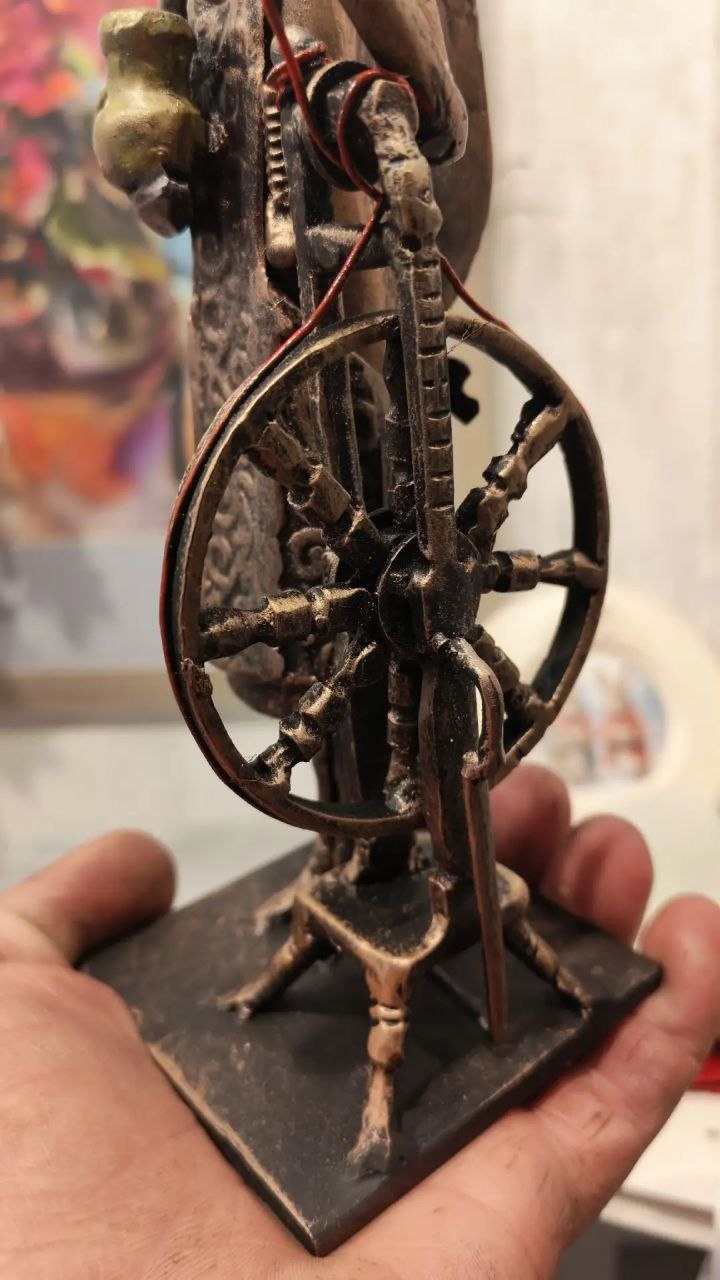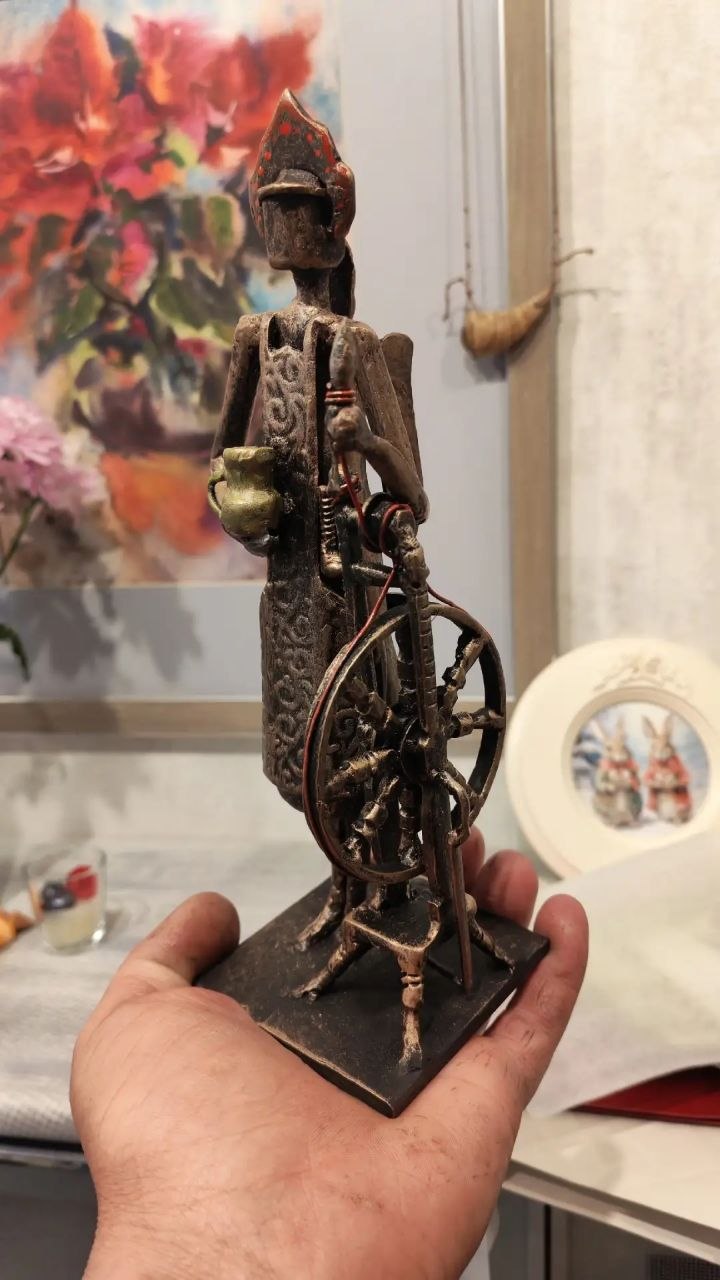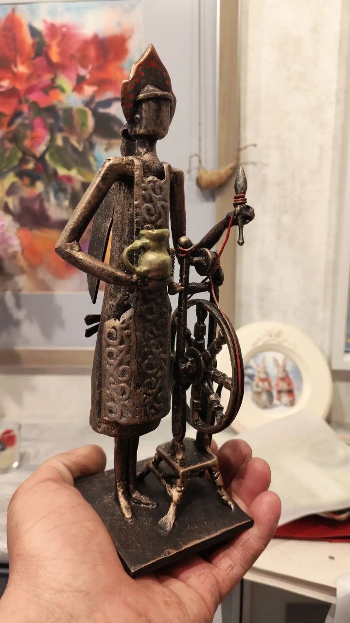 Фигурка представляет собой образ русской крестьянки. На голове у неё кокошник, одета она в узорчатый фартук, в одной руке держит кувшин, а второй опирается на прялку.