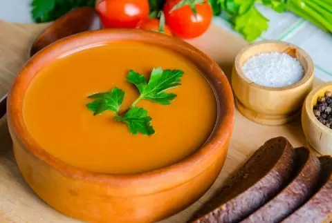 Цвет супа может варьироваться от ярко-красного до бледного, что зависит от использованных помидоров.