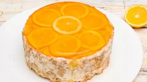 4. Нарежьте апельсины и соберите торт. Тщательно перемешайте крем и крекеры, выкладывая массу на застывшее желе.
