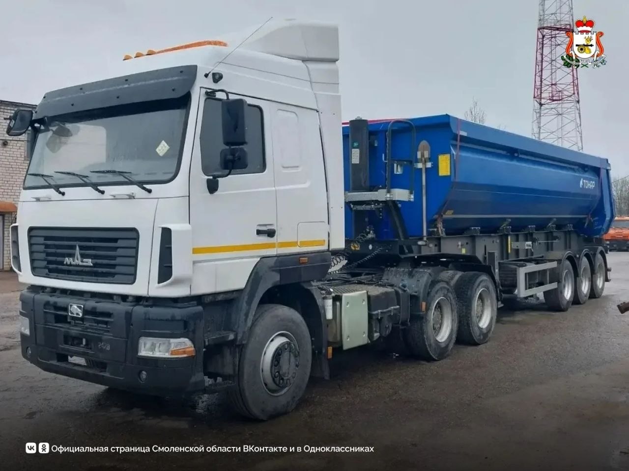 В «Смоленскавтодор» поступила новая современная техника. В Смоленский и Ельнинский филиалы направлены два седельных тягача МАЗ-643028 с полуприцепами «ТОНАР» для перевозки грузов. Еще один такой автопоезд ожидается в ближайшее время.