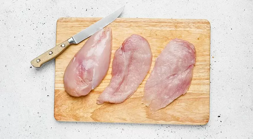Для начала куриное филе необходимо аккуратно разрезать вдоль, чтобы получить более тонкие пласты. Мясо помещается в пакет и слегка отбивается, после чего его следует приправить солью, перцем и кориандром. Важно, чтобы специи впитались в курицу, поэтому стоит оставить филе мариноваться на некоторое время.