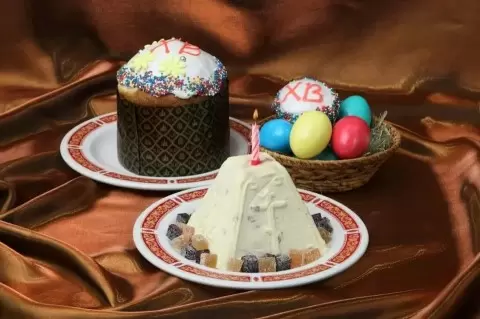 - Кулич, покрытый белоснежной глазурью, ставший олицетворением праздника;
