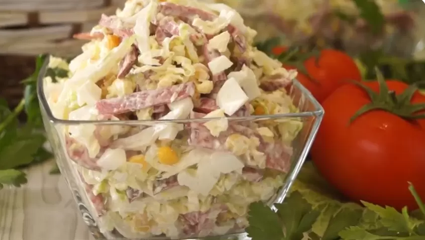 Это не просто обычный набор ингредиентов, а гармония вкусов и текстур: хрустящая и сочная пекинская капуста, ароматы копченой колбасы, традиционные яйца и сладкая консервированная кукуруза. Легкость и минимализм — главные достоинства этого рецепта, который подходит как для семейного ужина, так и для праздничного стола.