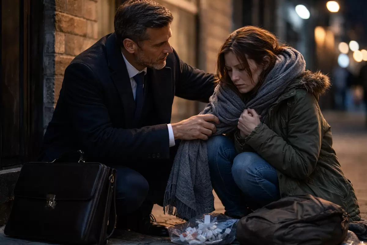 В тот вечер, однако, что-то стало не так, как обычно. После тяжёлого трудового дня, когда его мысли ворочались, как перегруженный вагон, взгляд Сергея вдруг зацепился за фигурку у стены старого магазина. Он заметил девушку, сидящую на холодном бетоне, накрывшую себя слишком тонким пальто, с опущенной головой и дрожащими руками. Рядом валялся маленький рюкзак и пакет с некупленными медикаментами.