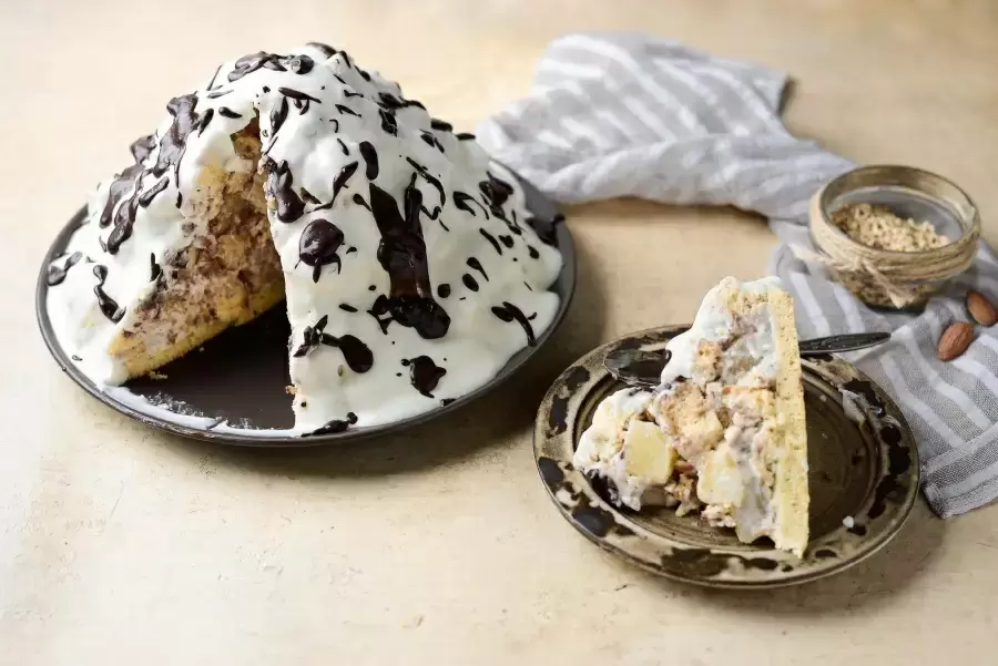 Крем делят на две части: одну смешивают с 100 г измельчённого миндаля. На сервировочное блюдо выкладывают корж, покрывают небольшим слоем крема без орехов, добавляют кусочки ананасов и немного орехов. Кусочки коржа опускаются в ореховый крем и выкладываются сверху. Продолжая чередовать слои, формируется пирамидка. Затем торт покрывают оставшимся кремом и украшают растопленным шоколадом, после чего убирают в холодильник на ночь для пропитки.
