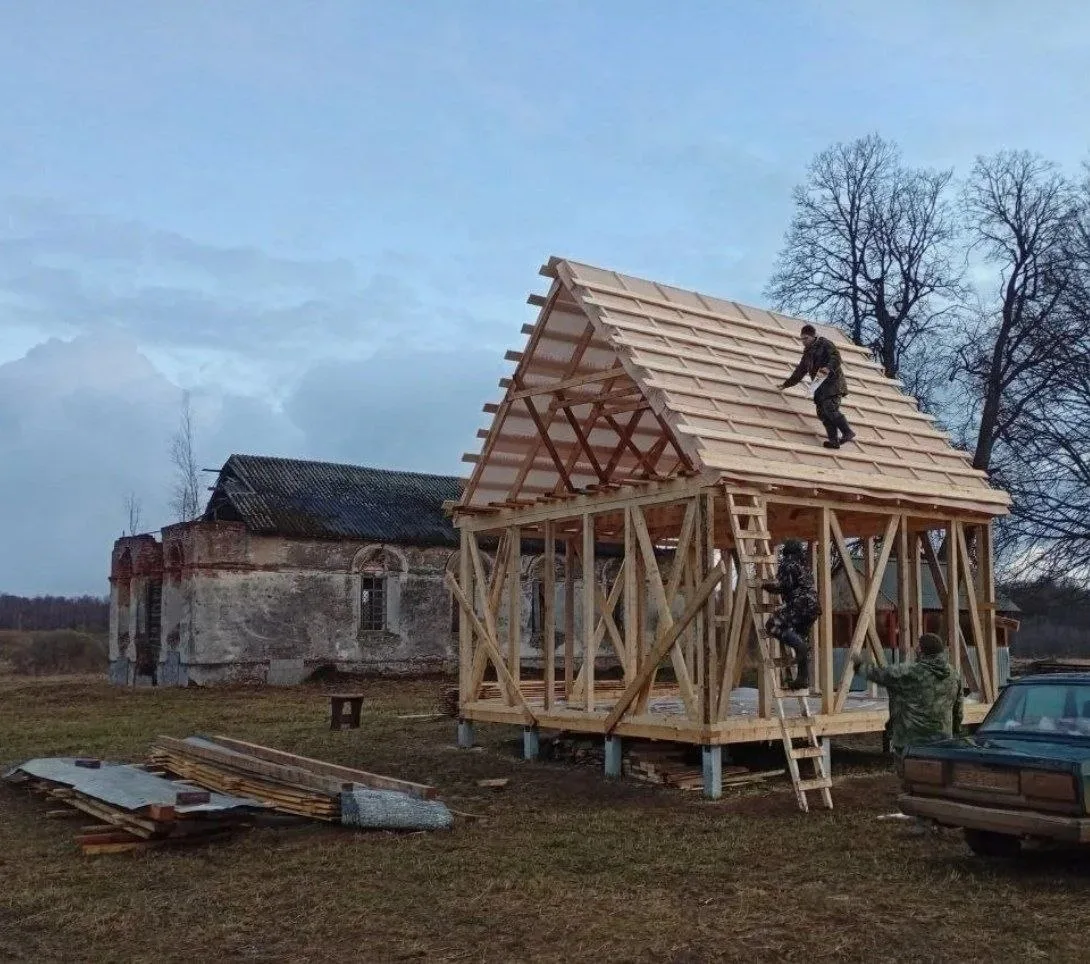 Уже возведен каркас церкви, она расположится рядом со старым каменным храмом, который сейчас также укрепляется.